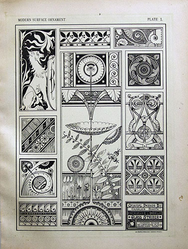 First edition. 15" high x 12" wide. 24 plates illustrating designs by stained glass craftsmen, illustrators and architects, including Charles Booth. Three-post cloth binding (not original) has been re-covered. The plates are on tabs for the binding holes. VG+, Plates are clean; there are some stray pencil marks & smudges in the margins of some plates, not affecting the images. Originally issued in six parts, this book features 24 Anglo-Japanesque designs by Booth (Plate 1) and several other ornamentalists, including W.H. Wood, Arthur Halliday, Charles R. Lamb, O.S. Teale, H.E. Ficken, Charles M. Jenckes, Milton See, Otto Heinigle, George E. Harney, Louis D. Berg, and publisher J. O'Kane. "This work contains a great variety of detail ornament, such as panel and corner filling, borders, centers, diapers, etc., all of original design by artists of undoubted standing, and mostly prepared specially for this work." [Building Age. Vol. 5, No. 2, Feb. 1883] Charles Booth (1844-1893), a stained-glass artist from Liverpool, came to work in the United States by 1875, bringing with him the English aesthetic design principles espoused by Christopher Dresser and thereby adding a certain abstraction, a totally different dimension, to the window form. Booth adhered remarkably closely to Dresser's advice, his work dominated by Dresser's principles governing two-dimensionality of design and simplification of ornamental forms. Scarce