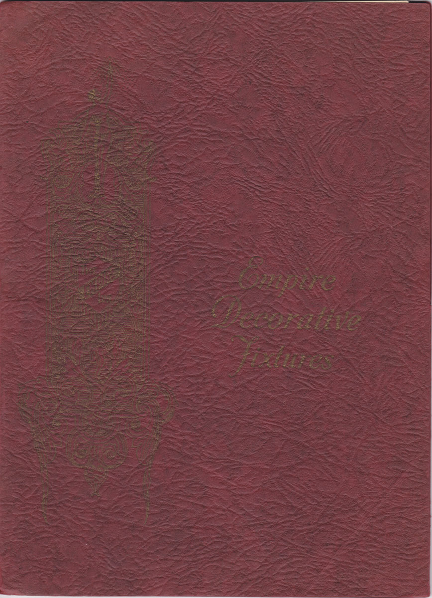 ca. 1920's. Quarto. 16 loose sheets numbered 1-16, in embossed folder with one pocket, lettering on cover. VG, sheets are clean & unmarked except for inked correction to one model number; folder in good shape though covers darkened & title lettering hard to read. The sixteen sheets (one-sided) feature four lines of ceiling and wall fixtures - Valencia, Versailles, Alamo, and Pueblo. The sheets provide sepia image, model No., dimensions, and price. One sheet features five crystal chandeliers. A separate "Notice" slip indicates this portfolio is for use by retail outlets, "The loose leaf arrangement and the omission of trade names permit a proper display of our fixtures to your customers." Top of each sheet features image of eagle logo.