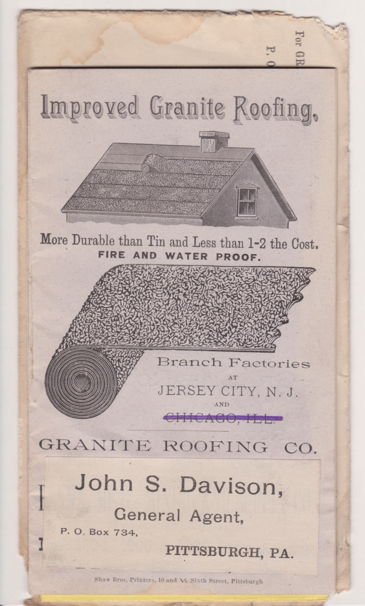Sixteenmo. 16pp, plus folded leaf and envelope. Stab bound. VG. Early brochure promoting the granite roofing co, with instructions for use and testimonials. Separate folded leaf for the Laing Manufacturing Co. for corrugated wool felt paper for covering pipes, as well as asbestos products. John S. Davidson was the treasurer for Laing and the general agent for both companies. Includes original mailing envelope.