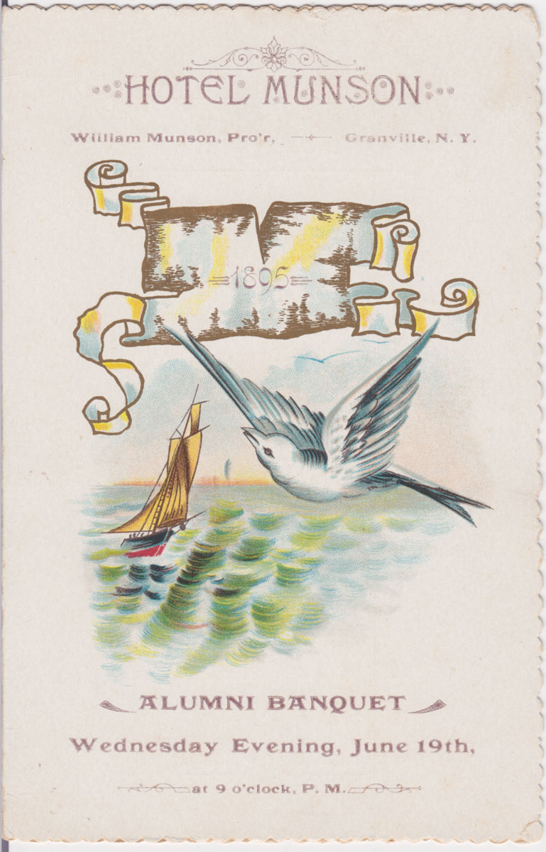 7" x 4.5". Fold-out card stock with crimped edges. Menu for Alumni Banquet, Wednesday evening, June 19, at 9 o'clock, P.M. Color cover image of seagull flying over sea with sailing ship below image of parchment banner showing date -1895. Meal featured soup, fish, boiled, roast, relishes, entrees, vegetables, and pastry.
